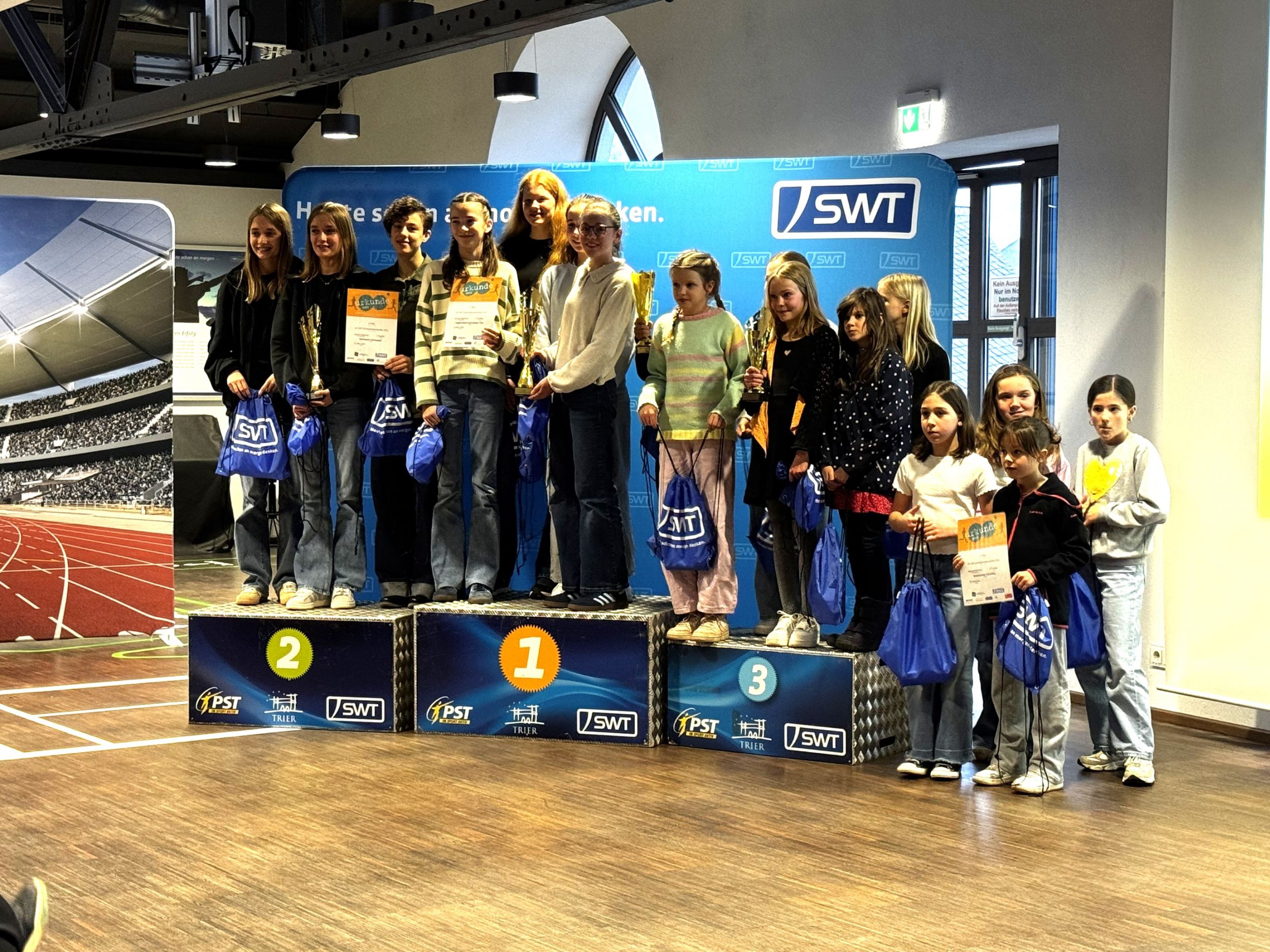 Als wir die Einladung zur Sportlerehrung des SWT in diesem Jahr erhielten, waren wir total überrascht. Da sich die Schullaufmeisterschaften im vergangenen Jahr mit dem Tanzwettbewerb der Grundschulen überschnitten hatten, konnten einige unserer Schüler und Schülerinnen nicht am Laufwettbewerb teilnehmen. Umso mehr freuten wir uns über die Einladung. Tatsächlich schafften es unsere jeweils drei schnellsten Läuferinnen aus den Jahrgängen 2015, 2016 und 2017 im schulweiten Vergleich auf Platz 3 hinter dem Angela-Merici-Gymnasium und dem Humboldt-Gymnasium.